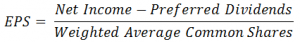 To calculate the EPS of a company, the balance sheet and income statement are used to find the weighted average number of common shares,dividents paid on preffered stocks (if any), and the net income or earnings. It is more accurate to use a weighted average number of common shares over the reporting term, because the number of shares can change over time. Any stock dividends or splits that occur must be reflected in the calculation of the weighted average number of shares outstanding. Some data sources simplify the calculation by using the number of shares outstanding at the end of a period.